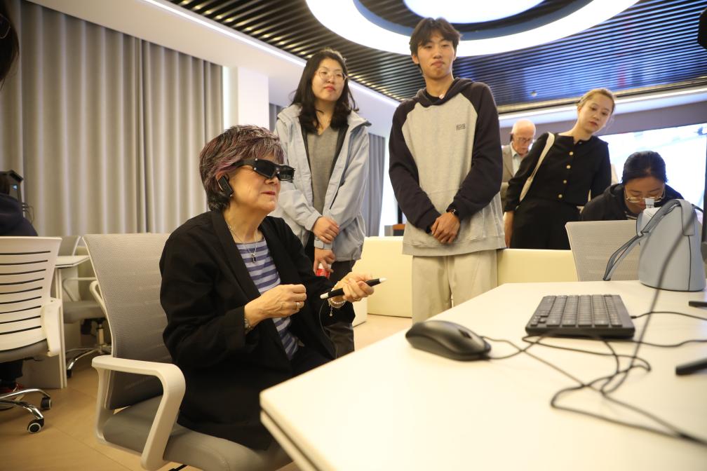 4月15日,在培黎職業(yè)學(xué)院,英中了解協(xié)會(huì)榮譽(yù)主席佐伊·里德體驗(yàn)學(xué)生們親手設(shè)計(jì)搭建的虛擬現(xiàn)實(shí)場(chǎng)景模型。新華社記者 張智敏 攝