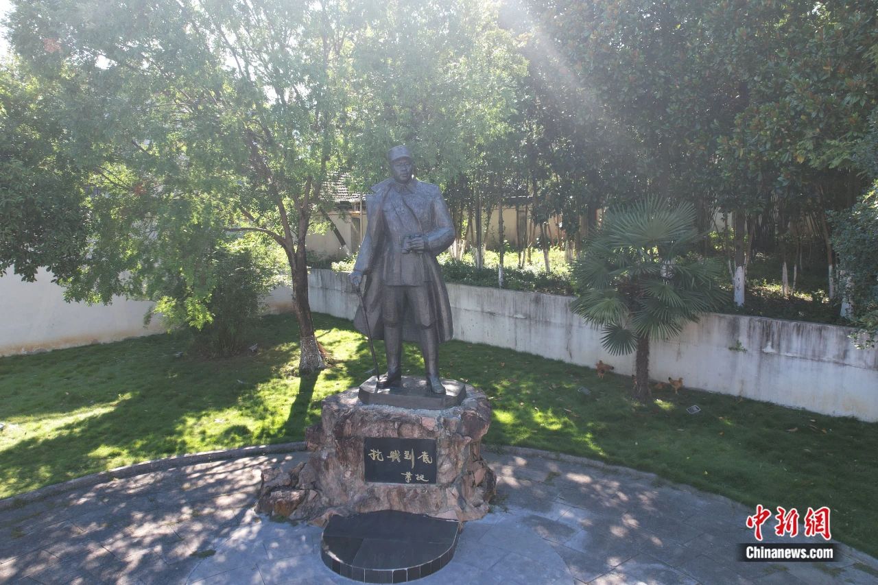 坐落在安徽涇縣云嶺鎮(zhèn)新四軍軍部舊址前的葉挺雕像。(無人機照片)張強 攝