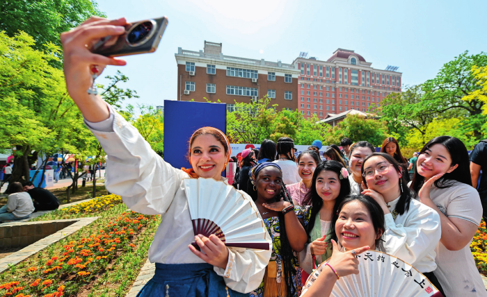 中外青年在以“上合之約天外同彩”為主題的天津外國(guó)語(yǔ)大學(xué)第八屆國(guó)際文化節(jié)上合影留念(2025 年 4 月 20 日攝)孫凡越攝 / 本刊