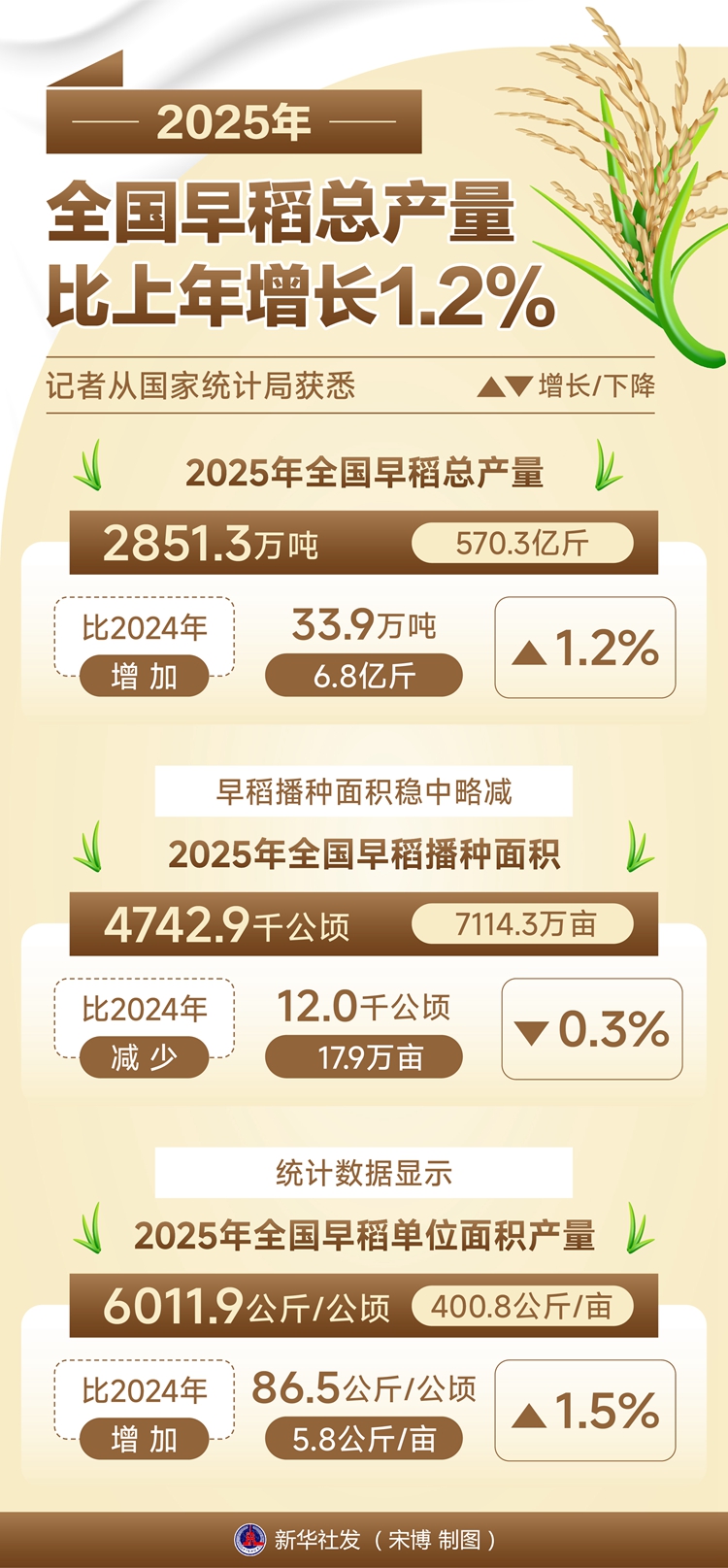 記者從國家統(tǒng)計局獲悉,2025年全國早稻總產(chǎn)量2851.3萬噸(570.3億斤),比2024年增加33.9萬噸(6.8億斤),增長1.2%。