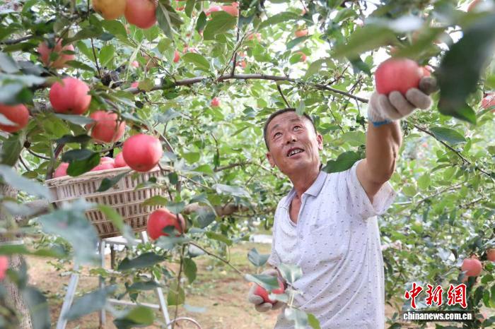 圖為陜西省延安市洛川縣的果農(nóng)正在采摘早熟蘋果。 李進 攝
