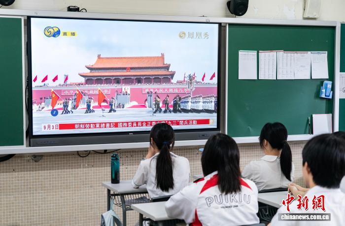 9月3日,香港培僑中學(xué)學(xué)生觀看紀(jì)念中國(guó)人民抗日戰(zhàn)爭(zhēng)暨世界反法西斯戰(zhàn)爭(zhēng)勝利80周年大會(huì)直播。中新社記者 侯宇 攝