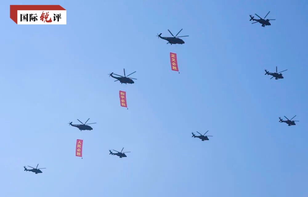 閱兵儀式上,一個(gè)細(xì)節(jié)引人關(guān)注:3架直升機(jī)分別懸掛“正義必勝”“和平必勝”“人民必勝”的條幅飛過(guò)天安門廣場(chǎng)。這“三個(gè)必勝”既是歷史啟示的偉大真理,也是對(duì)當(dāng)下和未來(lái)的重要啟迪。