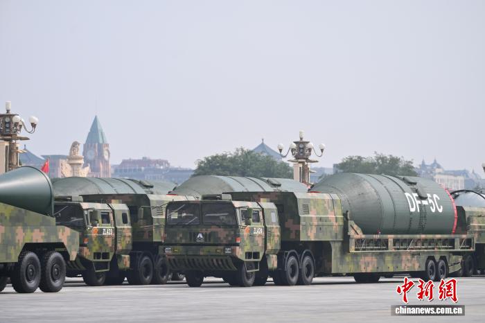 9月3日,紀(jì)念中國(guó)人民抗日戰(zhàn)爭(zhēng)暨世界反法西斯戰(zhàn)爭(zhēng)勝利80周年大會(huì)在北京隆重舉行。圖為核導(dǎo)彈第二方隊(duì)“東風(fēng)-5C”液體洲際戰(zhàn)略核導(dǎo)彈駛過天安門廣場(chǎng)?!≈行戮W(wǎng)記者 趙文宇 攝