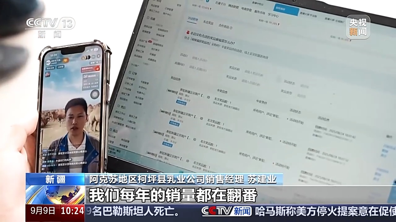 阿克蘇地區(qū)柯坪縣乳業(yè)公司銷售經(jīng)理 蘇建業(yè):我剛才播了大概有1個(gè)小時(shí),已經(jīng)賣了有4萬多元了,我們每年的銷量都在翻番。