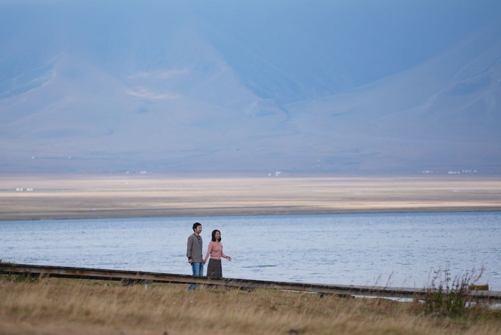 ↑ 9月10日,游客在賽里木湖畔游玩。