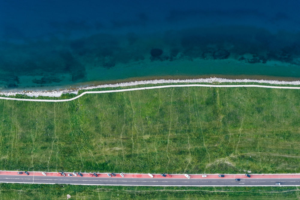 ↑ 賽里木湖景致(無人機照片,7月8日攝)。