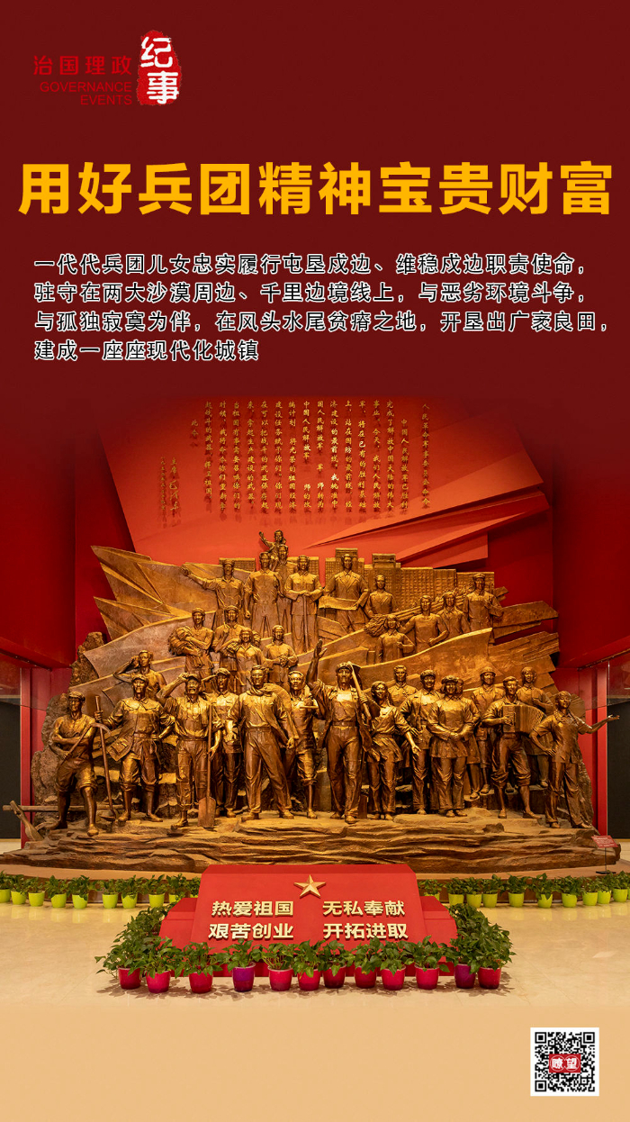 ◇2022年7月,習(xí)近平總書記在新疆考察時來到新疆生產(chǎn)建設(shè)兵團八師石河子市,參觀新疆兵團軍墾博物館。會見兵團老中青三代建設(shè)者代表時,他強調(diào),新疆生產(chǎn)建設(shè)兵團為推動新疆發(fā)展、增進民族團結(jié)、維護社會穩(wěn)定、鞏固國家邊防作出了不可磨滅的貢獻。兵團人鑄就的熱愛祖國、無私奉獻、艱苦創(chuàng)業(yè)、開拓進取的兵團精神,是中國共產(chǎn)黨人精神譜系的重要組成部分,要用好這些寶貴財富。
