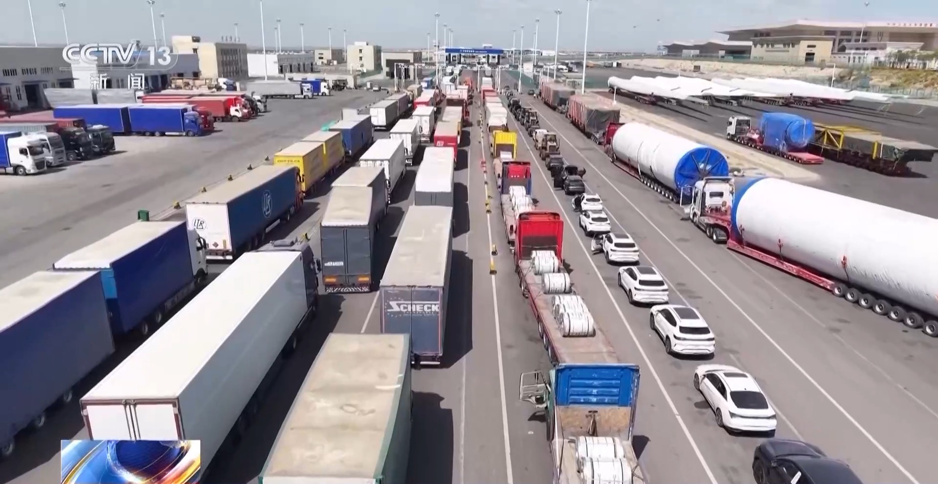 總臺(tái)央視記者 李廈:這里是霍爾果斯公路口岸,看我身邊龐大的車流,不僅有滿載跨境包裹的大貨車、更是有一眼望不到頭的國產(chǎn)新能源車和農(nóng)用機(jī)械車輛,甚至還有長達(dá)數(shù)十米的風(fēng)機(jī)葉片,這些琳瑯滿目的中國好貨,正在24小時(shí)不停歇地從這條黃金大通道駛出國門。