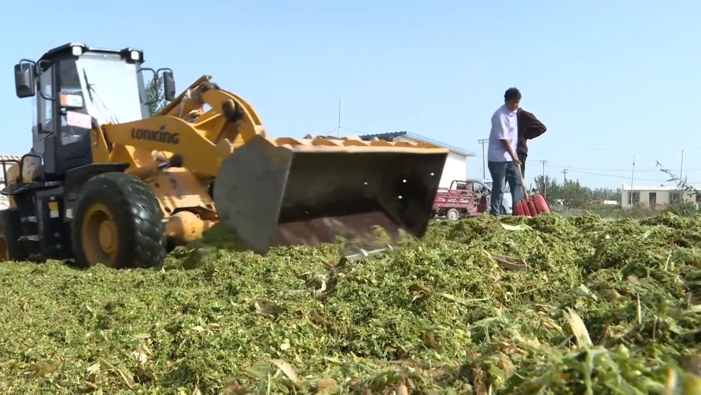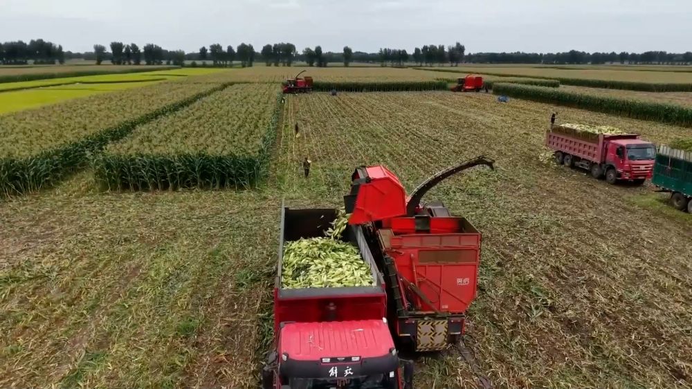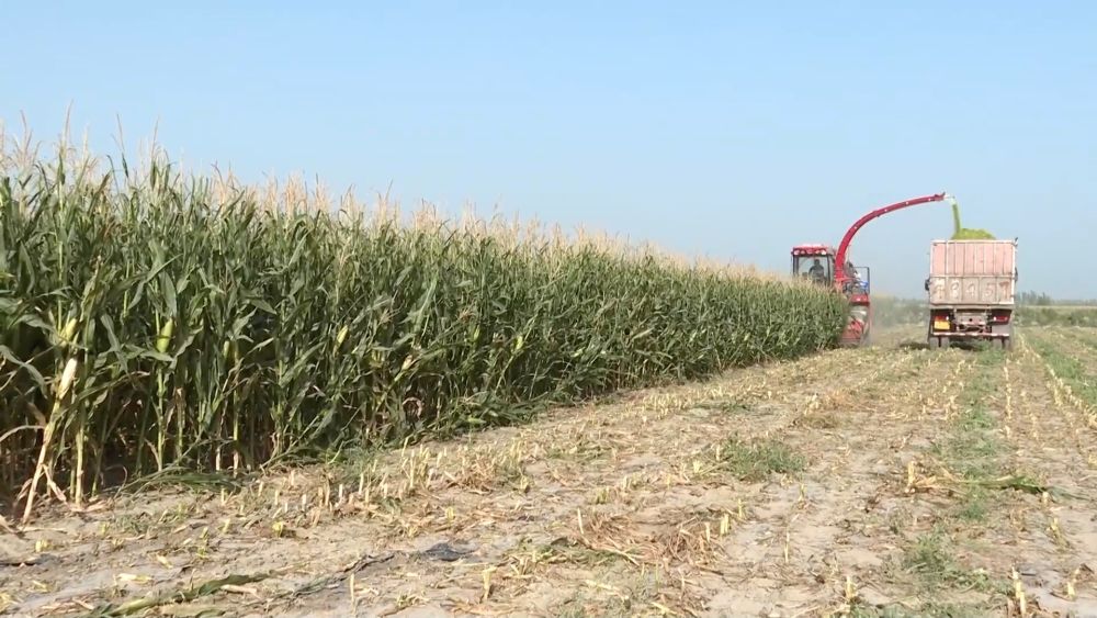 新疆巴音郭楞蒙古自治州焉耆縣的1.5萬(wàn)畝青貯玉米迎來(lái)豐收。在永寧鎮(zhèn)九號(hào)渠村,大型青貯收割加工機(jī)將一株株玉米從根部割斷,粉碎后拋入集草車。