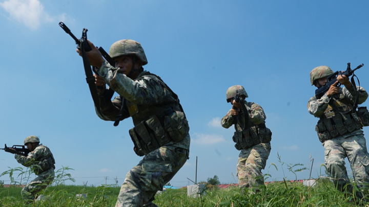 烈日灼人,汗水混雜著泥土粘在作訓(xùn)服上。但戰(zhàn)士們一絲不茍,目光如炬,動(dòng)作凌厲,搜索、突擊、越障、匍匐……一舉一動(dòng)彰顯著人民軍隊(duì)的凜然軍威與中國軍人的過硬本領(lǐng)。?