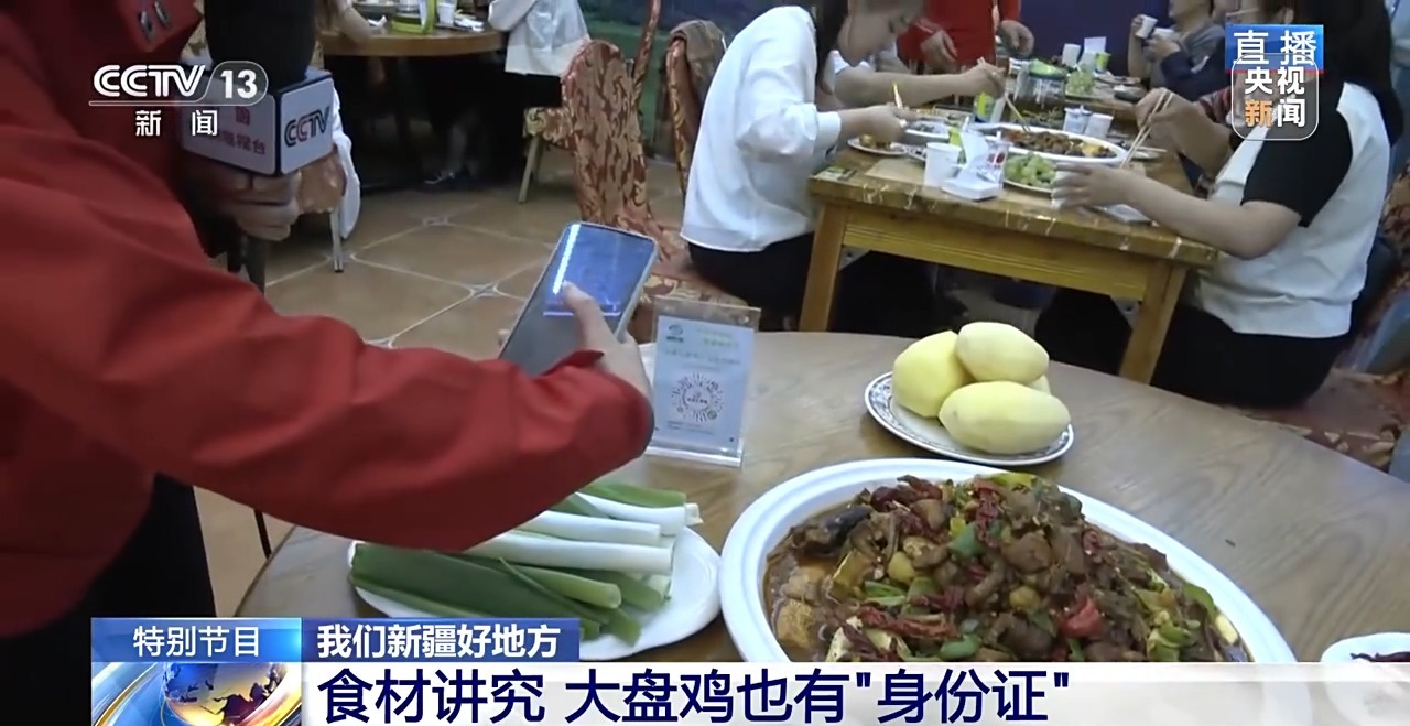 其實,大盤雞里的每一種原料,都是新疆農(nóng)業(yè)發(fā)展的縮影。先說這最主要的雞肉,是來自當?shù)貥藴驶B(yǎng)的土雞,這可不是一般的雞,它讓大盤雞有了“電子身份證”,我們來掃碼看看。