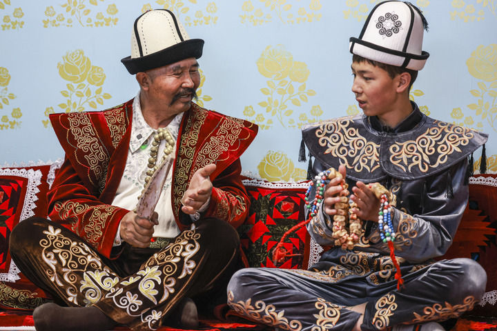 《瑪納斯》國家級非物質文化遺產代表性傳承人江努日·圖日干巴依(左)教徒弟演唱《瑪納斯》(2025年4月21日攝)。新華社記者 王菲 攝