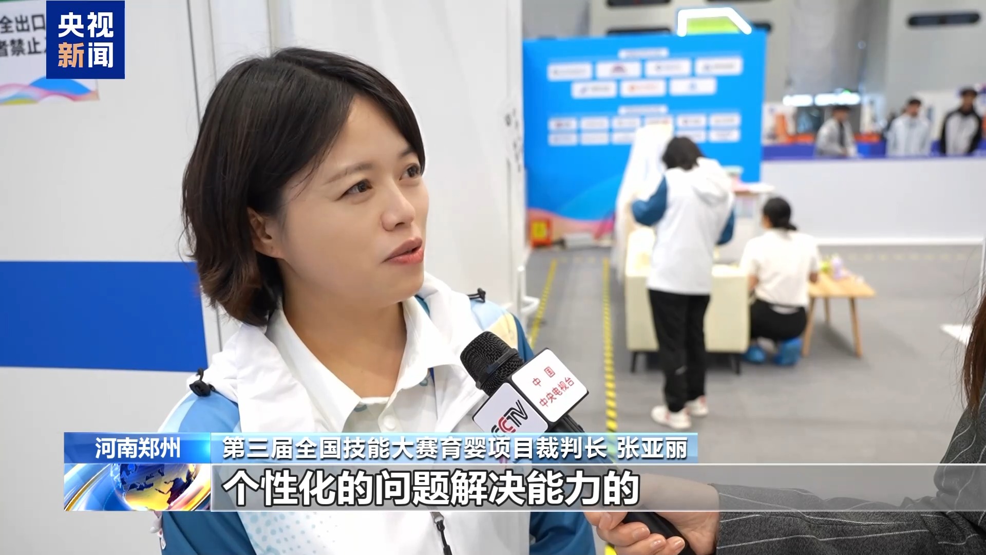 第三屆全國技能大賽育嬰項目選手 郭俊娜:比如給寶寶喂奶,以前可能只是憑經(jīng)驗,現(xiàn)在就要求抱孩子45度斜角。把流程標準化了,能夠更好地服務(wù)嬰幼兒以及家庭。