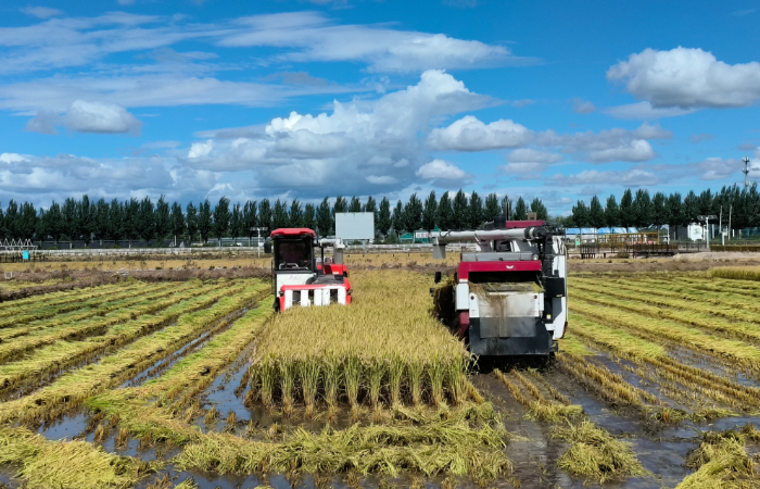 2025年9月9日,農(nóng)戶(hù)在內(nèi)蒙古興安盟扎賚特旗好力保鎮(zhèn)古廟村稻田里搶收青糧。(扎賚特旗融媒體中心供圖)