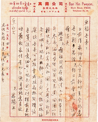 廼者兄獲祖國政府邀請,已決于本月下旬參與“緬甸華僑回國觀光團”回國一行,預決先到北京參加國慶大典,后即到各大城市觀光,料十一二月間可能回抵福建,故吾弟可由報章或政府機關(guān)探詢吾等(須注意“緬甸”之觀光團)行程,前來把晤,藉敘家情,是切勿誤。