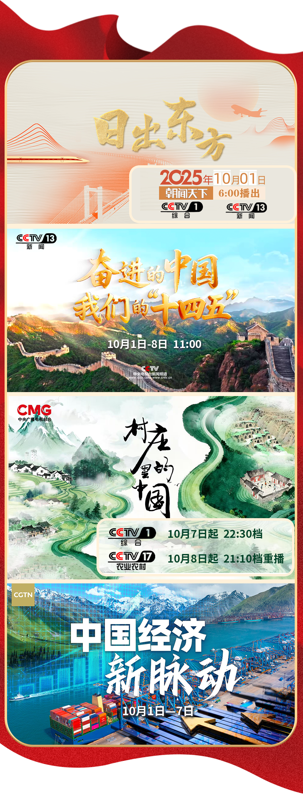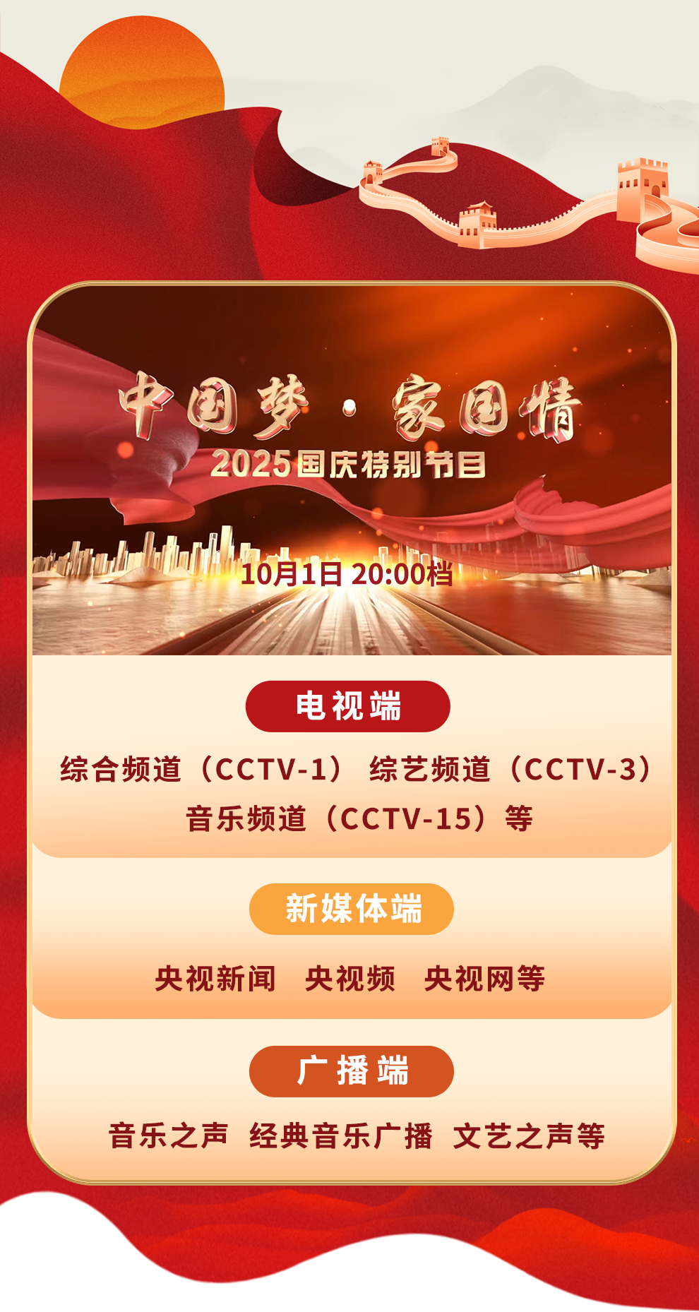金秋潑彩山河醉,家國同輝氣象新。10月1日晚八點(diǎn),《中國夢(mèng) 家國情——2025國慶特別節(jié)目》將在《我愛你中國》的大合唱中拉開大幕。特別節(jié)目走進(jìn)城市地標(biāo)與文化遺址,展現(xiàn)山河新貌與奮斗者群像。經(jīng)典曲目、交響合唱、新創(chuàng)歌曲傳遞濃濃家國情懷。抗戰(zhàn)老兵、奧運(yùn)冠軍、各行各業(yè)奮斗者深情講述……整場(chǎng)節(jié)目,洋溢著中華民族偉大復(fù)興勢(shì)不可擋的壯志豪情。