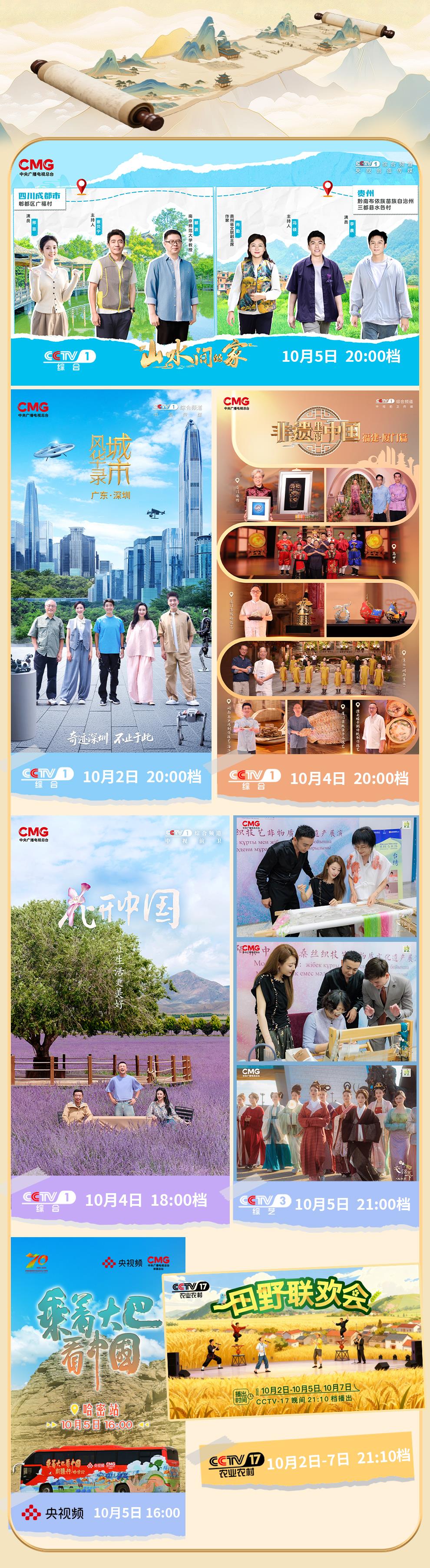 八天假期,想好去哪兒玩了嗎?來,跟著總臺(tái)去打卡!頭兩站:四川、貴州!《山水間的家(第四季)》“山水小分隊(duì)”邀你在川西林盤探韭香產(chǎn)業(yè),在黔南山鄉(xiāng)看巖椒成林。第三站:廣東。《城市風(fēng)華錄》帶你去深圳探訪全球首家機(jī)器人6S店,感受“奇跡之城”向新向好的澎湃動(dòng)力。第四站:福建。珠繡、漆線雕、閩南童謠、高甲戲……看《非遺里的中國》,領(lǐng)略廈門非遺之美。第五站:新疆。從《花開中國》開啟一場(chǎng)跨越天山的芬芳之旅,在《衣錦天下 絲路季》發(fā)現(xiàn)絲綢之路上的中國審美,《乘著大巴游中國》探尋哈密甜美密碼。第六站:內(nèi)蒙古。在通遼參加《田野聯(lián)歡會(huì)》,體驗(yàn)鄉(xiāng)土文化新活力。這八天的旅程,你不會(huì)錯(cuò)過雄奇的風(fēng)光、古老的文化、新奇的創(chuàng)造,還有熱氣騰騰的生活。