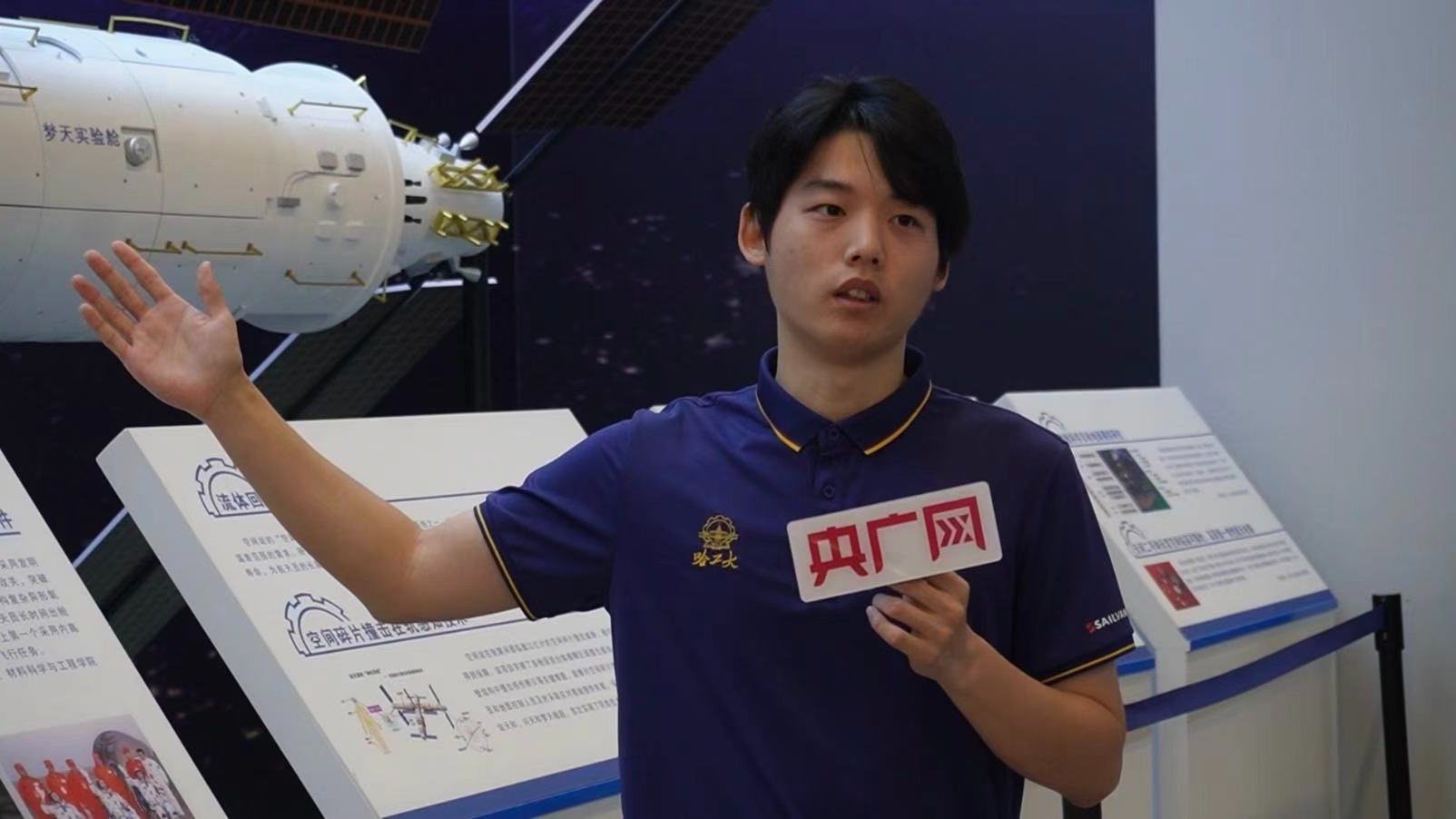 學(xué)生講解員郭鎮(zhèn)宇介紹由哈工大參與研制的問天實(shí)驗(yàn)艙小機(jī)械臂(央廣網(wǎng)發(fā) 王語詩 攝)