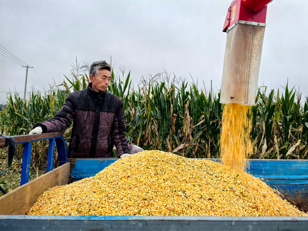 在菏澤市曹縣蘇集鎮(zhèn)一處農(nóng)田旁,收獲的玉米正在裝車。新華社記者葉婧 攝