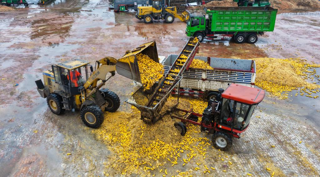 在山東省東營市廣饒縣一家糧食收儲企業(yè),工作人員在裝運玉米進行脫粒(無人機照片)。(劉云杰 攝)