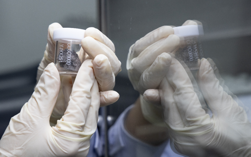 科研人員在月球樣品實(shí)驗(yàn)室展示嫦娥六號(hào)月球樣品。新華社記者 金立旺 攝
