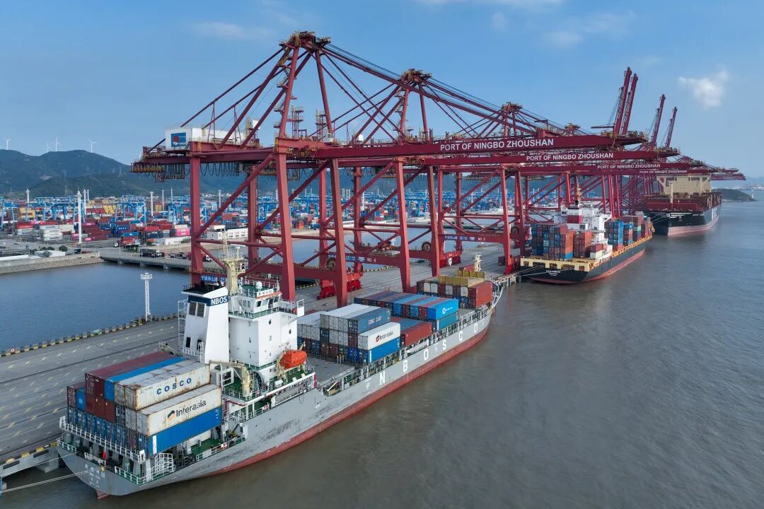 在寧波舟山港金塘港區(qū)大浦口集裝箱碼頭,船舶進行集裝箱裝卸作業(yè)。新華社發(fā)(鄒訓(xùn)永攝)