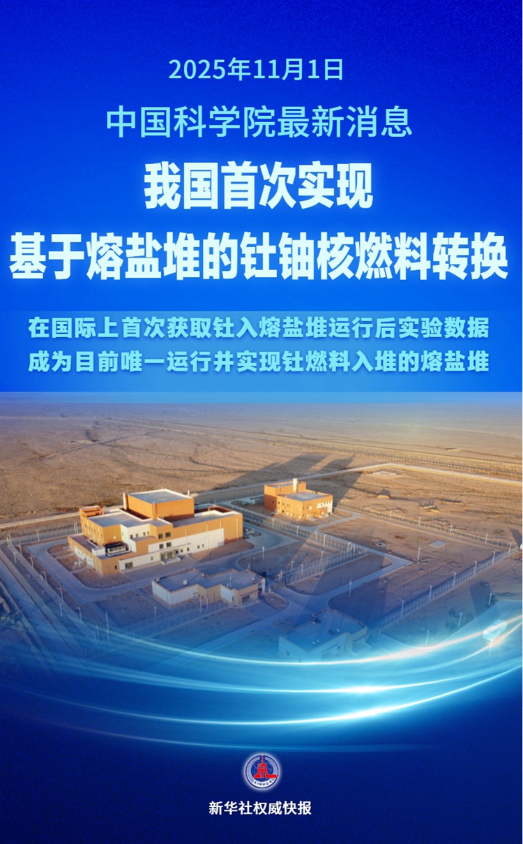 記者11月1日從中國科學院獲悉,由中國科學院上海應用物理研究所牽頭建成的2兆瓦液態(tài)燃料釷基熔鹽實驗堆,首次實現(xiàn)釷鈾核燃料轉(zhuǎn)換,在國際上首次獲取釷入熔鹽堆運行后實驗數(shù)據(jù),成為目前唯一運行并實現(xiàn)釷燃料入堆的熔鹽堆,初步證明了熔鹽堆核能系統(tǒng)利用釷資源的技術可行性,進一步鞏固了我國在國際熔鹽堆研究領域的引領地位。