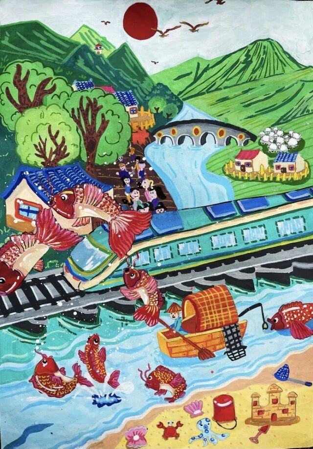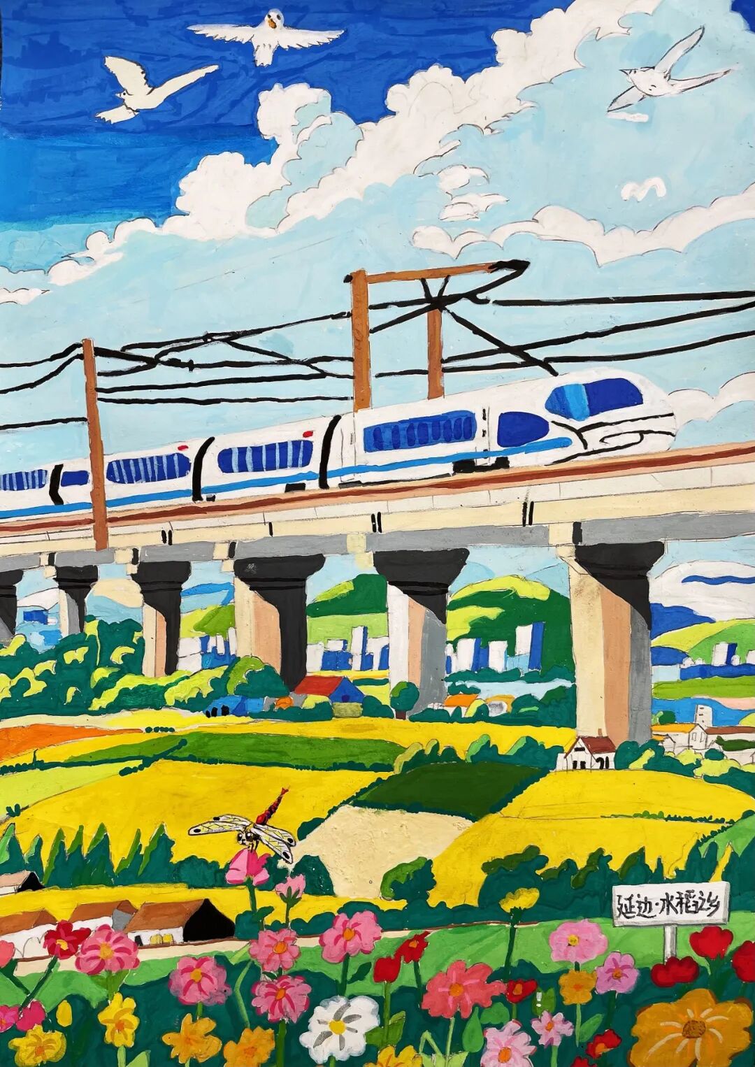 去年暑假,我和爸爸媽媽坐上普速列車去南京看望大爺爺。車窗外,九龍口濕地的蘆葦叢像綠色的波浪,成群的白鷺貼著水面掠過,偶爾還能看見漁民撐著小船在河道里穿梭。建湖特有的水鄉(xiāng)風(fēng)光漸漸后退,“哐當(dāng)哐當(dāng)”的車輪聲卻越來越清晰,仿佛是西塘河的流水聲化作了鋼軌上的旋律。鄰座的老爺爺笑著給我講起故事:“以前去南京,要先坐小船到碼頭,再轉(zhuǎn)汽車。現(xiàn)在火車直接開到家門口,建湖和外面的世界更近啦!”他布滿皺紋的手輕輕摸著車窗,眼睛里閃著光。