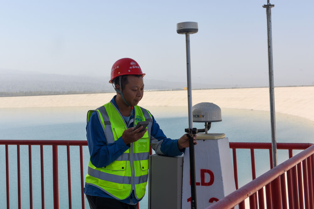 ↑ 11月1日,施工人員在奧吞勒克水庫(kù)檢查閘控系統(tǒng)設(shè)備試運(yùn)行情況。