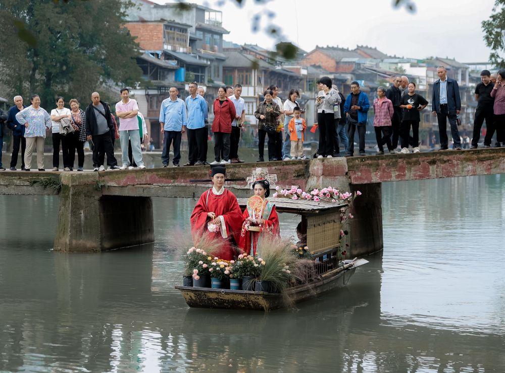 國慶節(jié)期間,成都邛崍市夾關古鎮(zhèn)舉行的水上婚禮儀式。(受訪單位供圖)