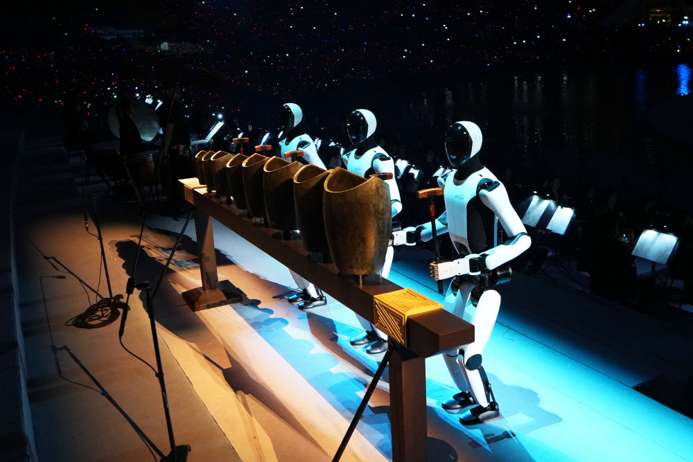 11月9日,開幕式上的工業(yè)人形機(jī)器人敲響千年前的中國(guó)古代樂器青銅句鑃。新華社記者 李一博 攝