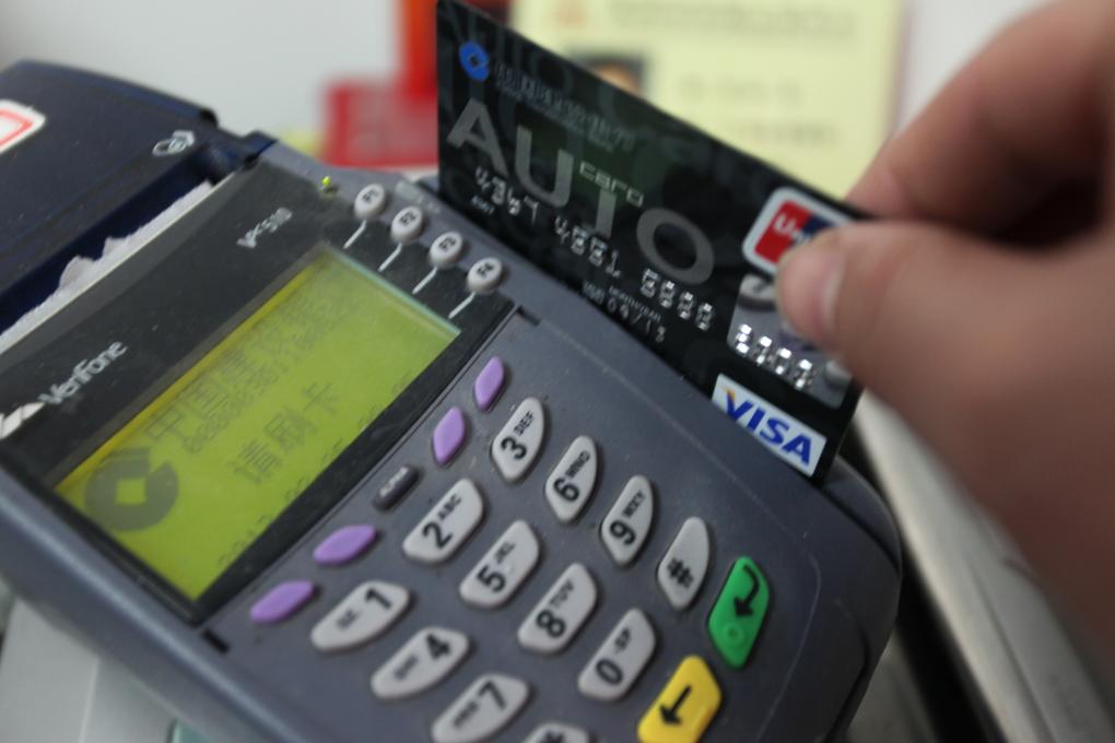 一商家工作人員在POS機上刷卡。新華社發(fā)(李俊鋒 攝)