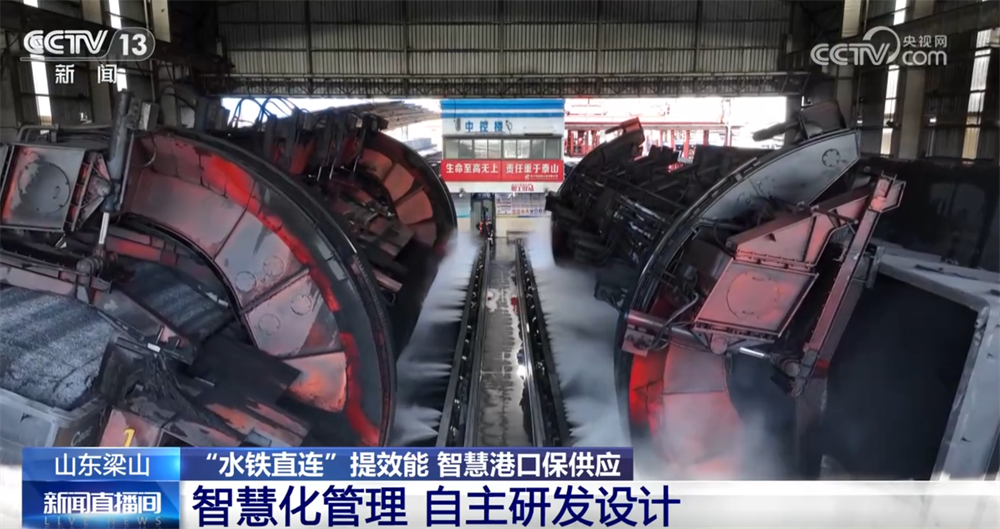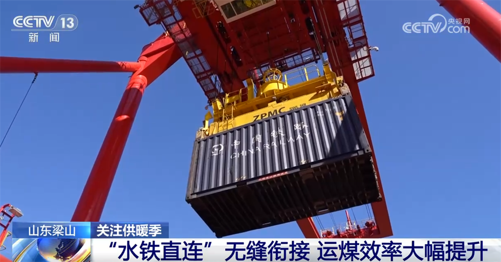 在現(xiàn)場,大家可以看到大型起重機正在往船上裝集裝箱,這是今年港口新推出的一種“水鐵直連”的煤炭運轉(zhuǎn)模式,就是把集裝箱的煤通過鐵路運到這里,不再經(jīng)過卸煤和存儲的過程,而是通過精準(zhǔn)的需求調(diào)度把集裝箱直接裝船,通過運河發(fā)往目的地。這種方式大幅縮短了煤炭運輸?shù)闹芷?,把整個周期從5天縮短到3天,也提升了港口能源保障的效率和能力。