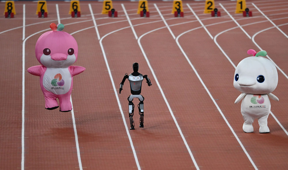 11月17日,在田徑項(xiàng)目賽事開(kāi)始前的暖場(chǎng)活動(dòng)中,機(jī)器人和吉祥物喜洋洋、樂(lè)融融在廣東奧體中心體育場(chǎng)賽跑。新華社記者 周牧 攝