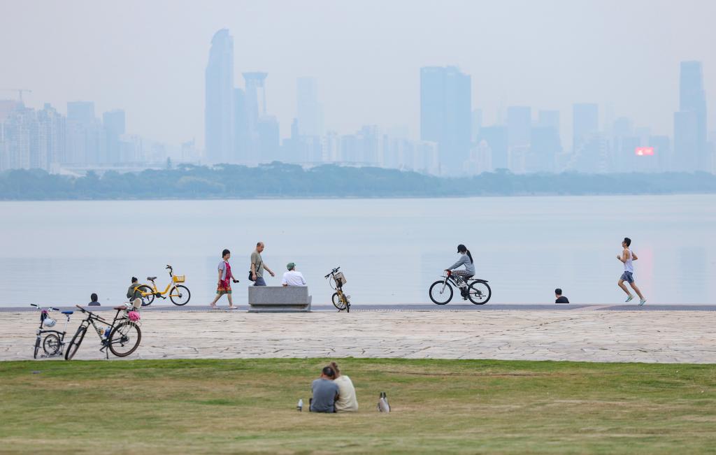 11月15日,在田徑項目男子馬拉松比賽中,參賽選手經(jīng)過深圳灣體育中心。