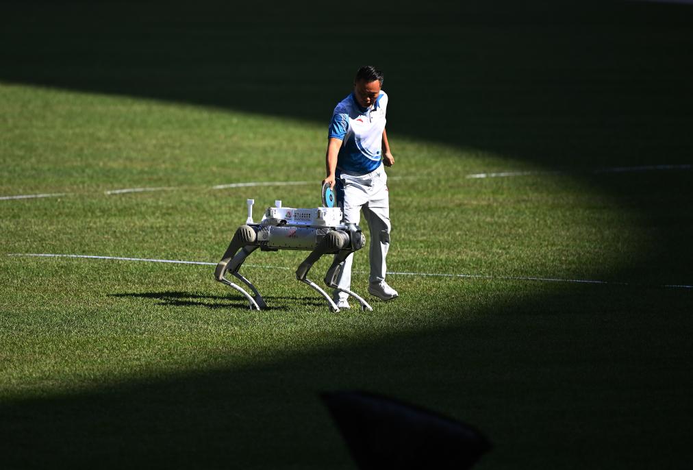 11月16日,在田徑男子十項全能鐵餅比賽中,機(jī)器人在運送鐵餅。
