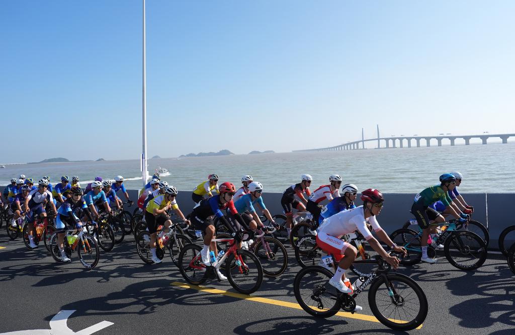 ↑11月8日,第十五屆全國運動會公路自行車男子個人賽決賽開賽,全程231.8公里,選手將經(jīng)過港珠澳大橋,跨越粵港澳三地。新華社記者 顏麟蘊 攝