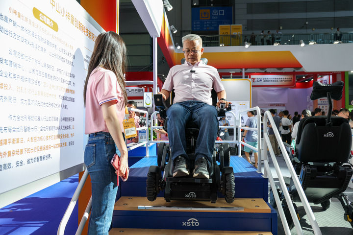 2025年9月12日,在2025深圳國際智慧養(yǎng)老產(chǎn)業(yè)博覽會上,觀眾在展會現(xiàn)場體驗一款可以上下樓梯的智能出行機(jī)器人。新華社記者 梁旭 攝