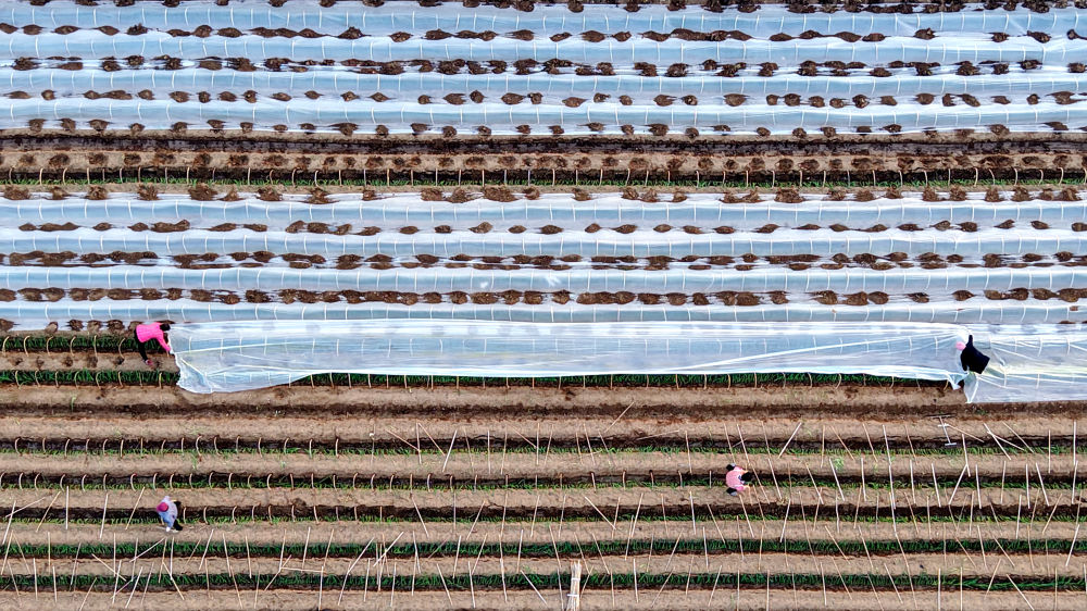 12月11日,在山東省臨沂市平邑縣地方鎮(zhèn),村民為種植的蔬菜幼苗覆蓋保溫薄膜(無人機照片)。 新華社發(fā)(武紀(jì)全攝)