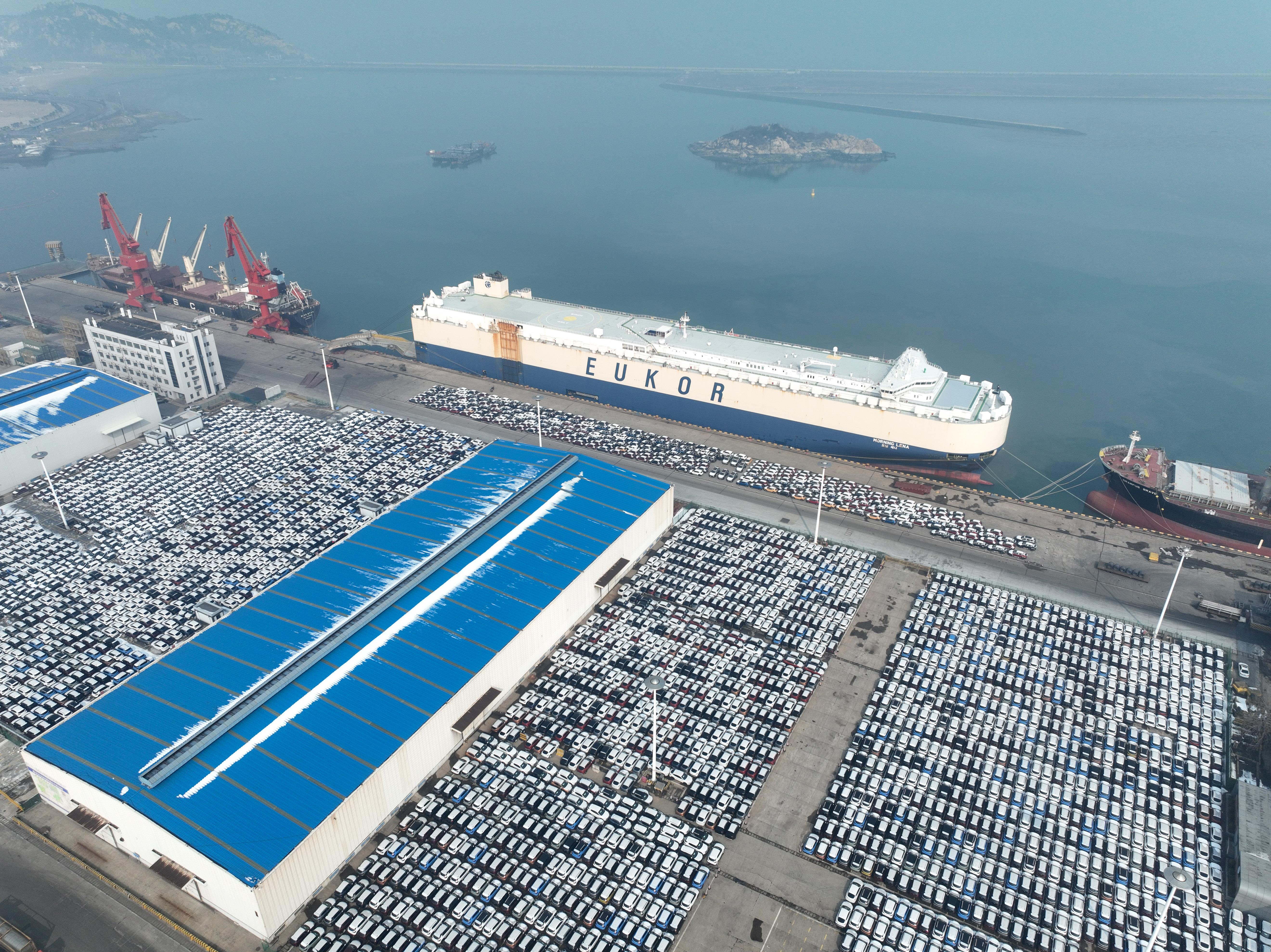 在江蘇連云港港東方港務(wù)分公司碼頭,貨輪靠泊準(zhǔn)備裝載汽車出口海外。