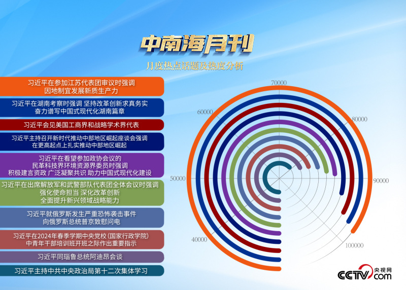 央視網“智聞”系統(tǒng)提取分析2024年3月全網時政新聞熱點顯示,“習近平總書記在湖南考察”“新時代推動中部地區(qū)崛起座談會”等相關話題備受關注。