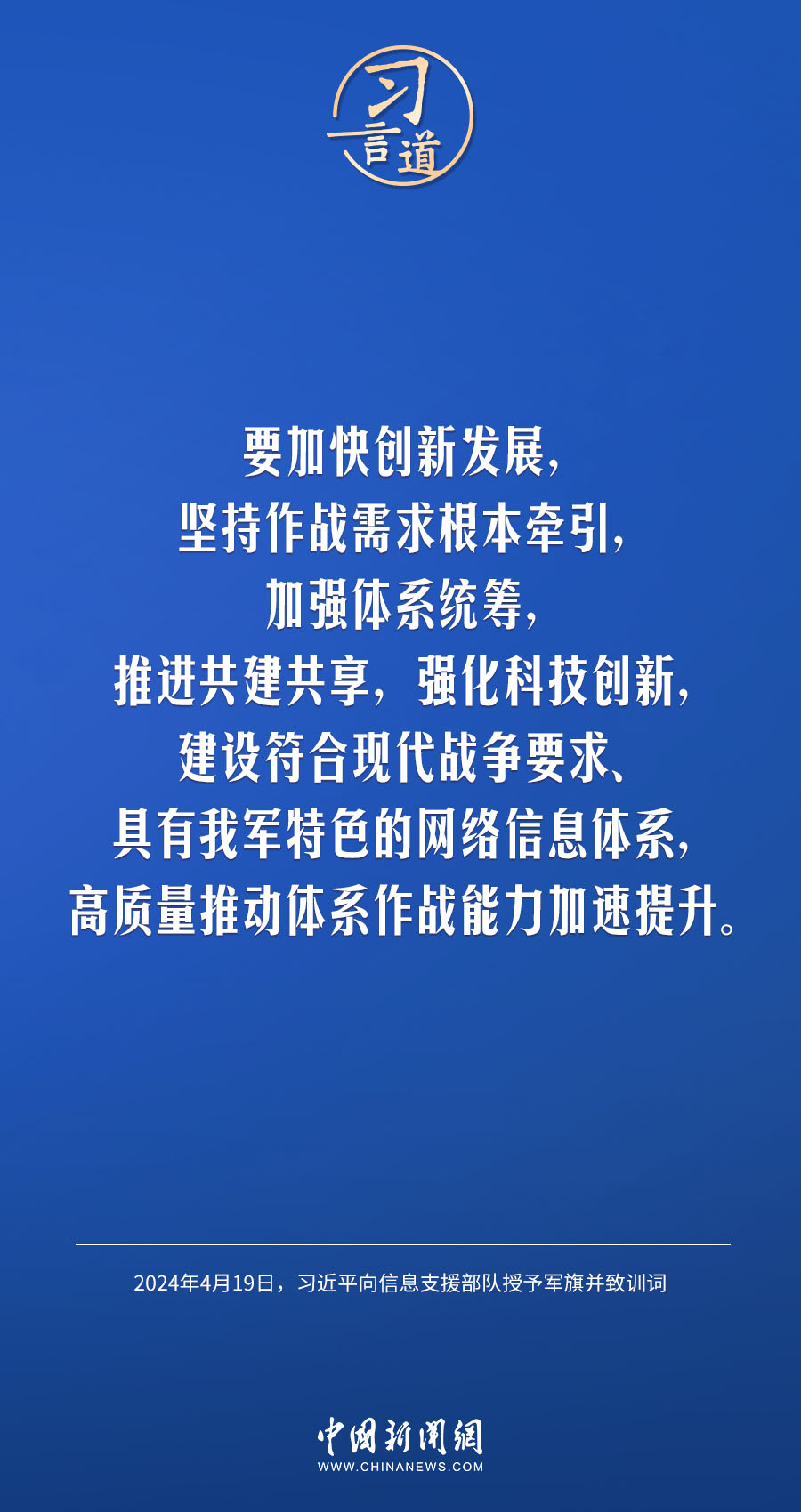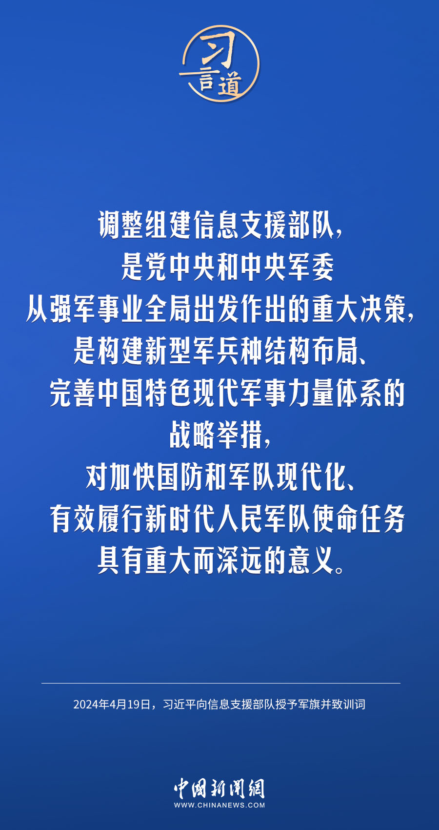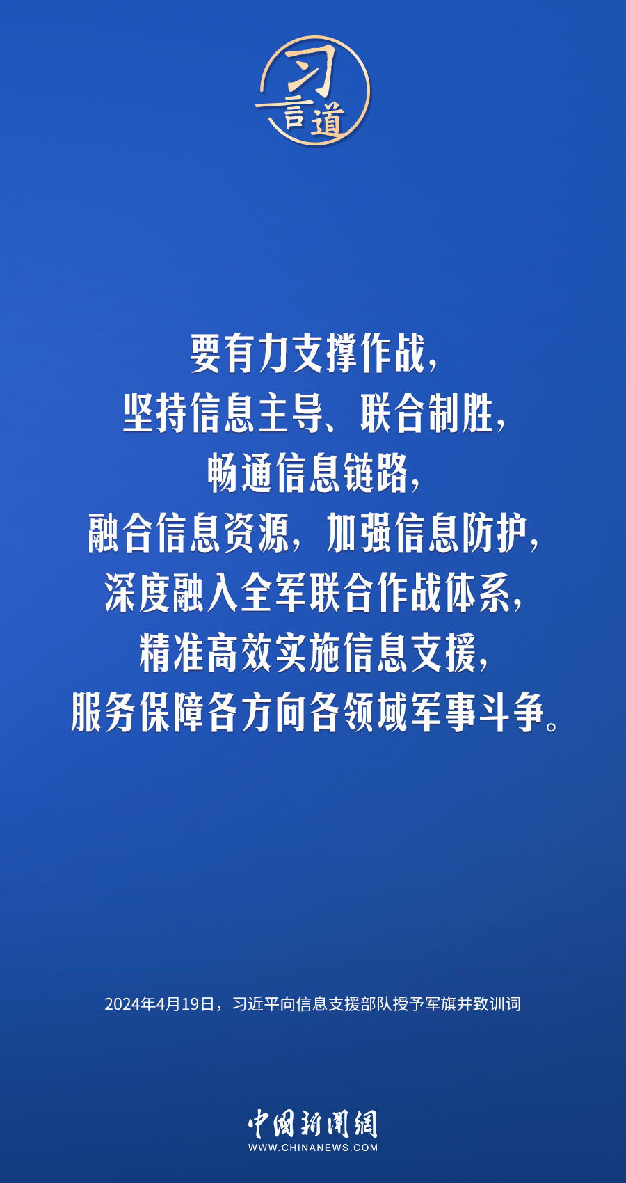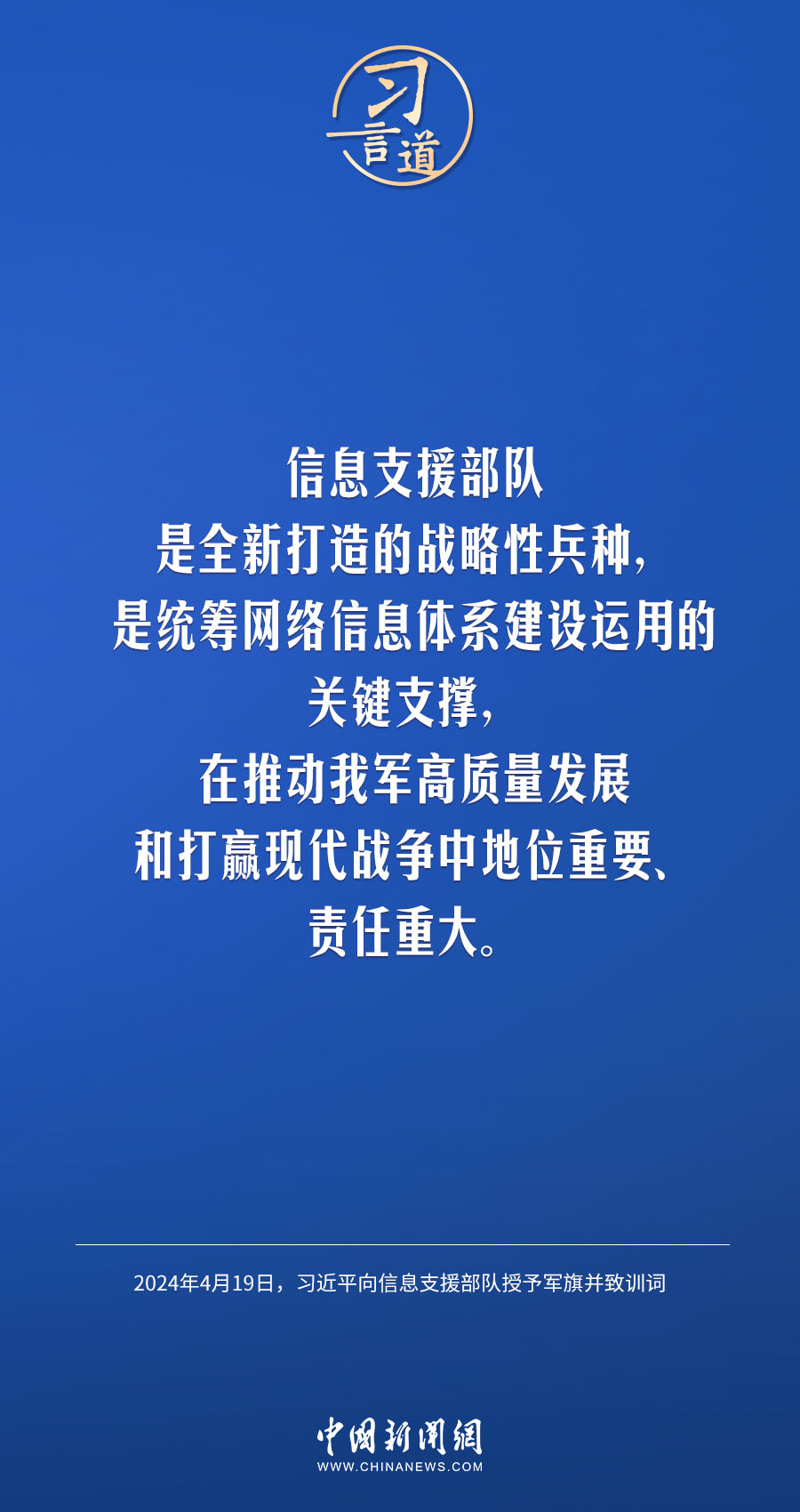 中國人民解放軍信息支援部隊成立大會19日在北京八一大樓隆重舉行。中共中央總書記、國家主席、中央軍委主席習近平向信息支援部隊授予軍旗并致訓詞,代表黨中央和中央軍委向信息支援部隊全體官兵致以熱烈祝賀。他強調——