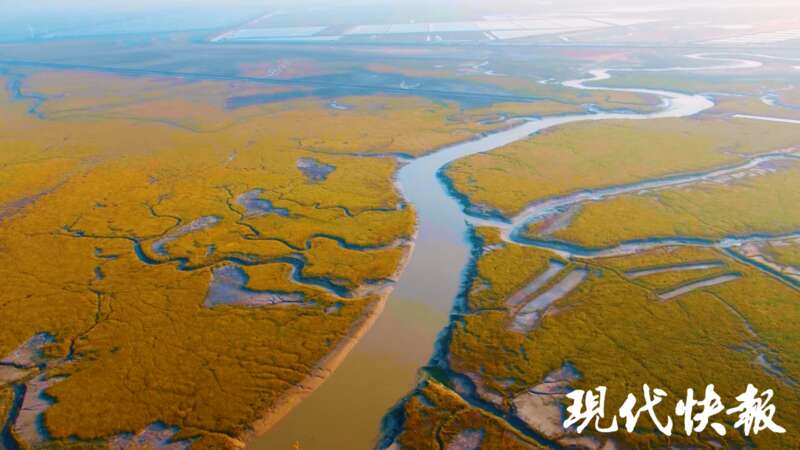 在江蘇南通啟東海域淺灘上,夕陽(yáng)映照海水雕刻的溝壑,形成一片金色的“潮汐樹”景觀。枝杈分明,栩栩如生?!俺毕珮洹笔浅睘┥习l(fā)育的潮溝水系,形態(tài)類似大樹,可以為生物提供養(yǎng)料、食物和庇護(hù)場(chǎng)所。