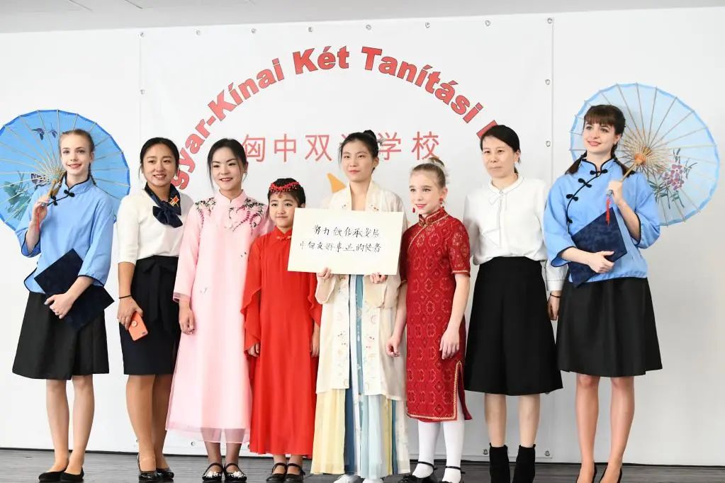 在匈牙利布達(dá)佩斯的匈中雙語學(xué)校,師生們?cè)趶?fù)信轉(zhuǎn)交儀式后手持“努力做傳承發(fā)展中匈友好事業(yè)的使者”的標(biāo)語合影。(圖源:新華社)