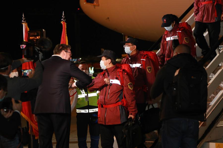 中國醫(yī)療團(tuán)隊(duì)在貝爾格萊德尼古拉·特斯拉機(jī)場(chǎng)降落時(shí)已是深夜。武契奇率領(lǐng)塞方多名高級(jí)官員到機(jī)場(chǎng)迎接。疫情期間不建議握手,于是這位塞爾維亞領(lǐng)導(dǎo)人選擇和中國專家團(tuán)成員一一碰肘以示尊重。對(duì)中國的及時(shí)支援心懷感激,他還在機(jī)場(chǎng)親吻了一面五星紅旗。