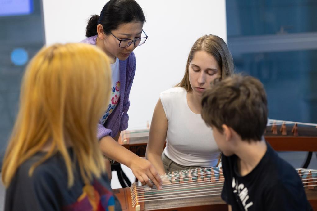 2024年4月29日,在塞爾維亞貝爾格萊德中國文化中心,古箏指導老師王宣(后左)在教學。新華社記者李京攝