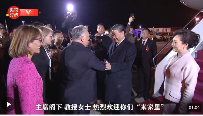 習(xí)近平乘坐的專機(jī)抵達(dá)布達(dá)佩斯國(guó)際機(jī)場(chǎng)時(shí),匈牙利總理歐爾班夫婦、外長(zhǎng)西雅爾多等政府高級(jí)官員熱情迎接。歐爾班總理對(duì)習(xí)近平主席夫婦說,歡迎你們“來家里”,我們感到極大榮光。