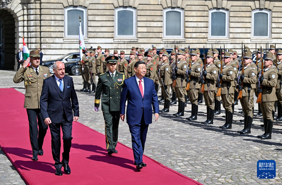 當?shù)貢r間5月9日上午,國家主席習近平在布達佩斯出席匈牙利總統(tǒng)舒尤克和總理歐爾班共同舉行的隆重歡迎儀式。這是習近平在舒尤克陪同下檢閱儀仗隊。新華社記者 殷博古 攝