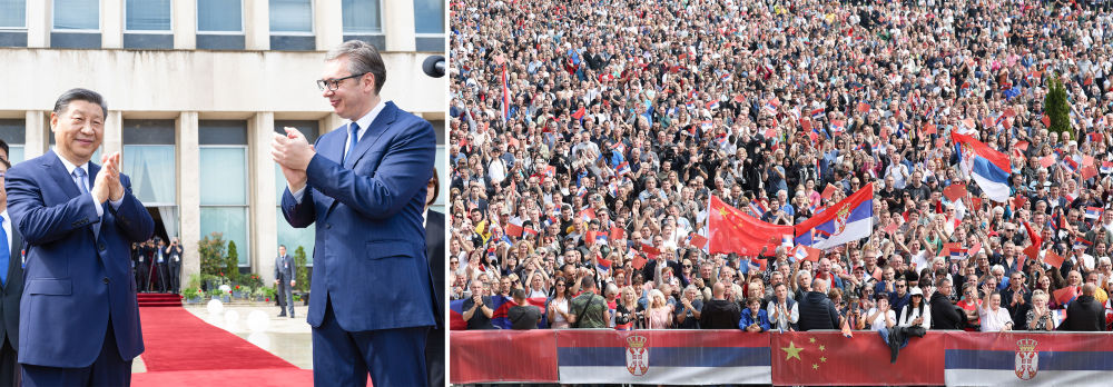 在塞爾維亞,武契奇總統(tǒng)率眾多政要赴機(jī)場迎接習(xí)近平主席。近2萬名塞爾維亞民眾齊聚塞爾維亞大廈廣場,揮舞中塞兩國國旗,熱情高呼“中國”的場景,令人感動(dòng);